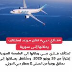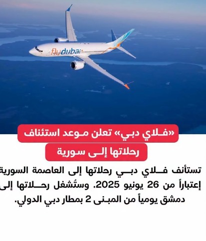 تستأنف فلاي دبي رحلاتها الى العاصمة السورية اعتبارا من 26-6-2025 و ستشغل رحلاتها الى دمشق يوميا من المبنى 2 بمطار دبي الدولي